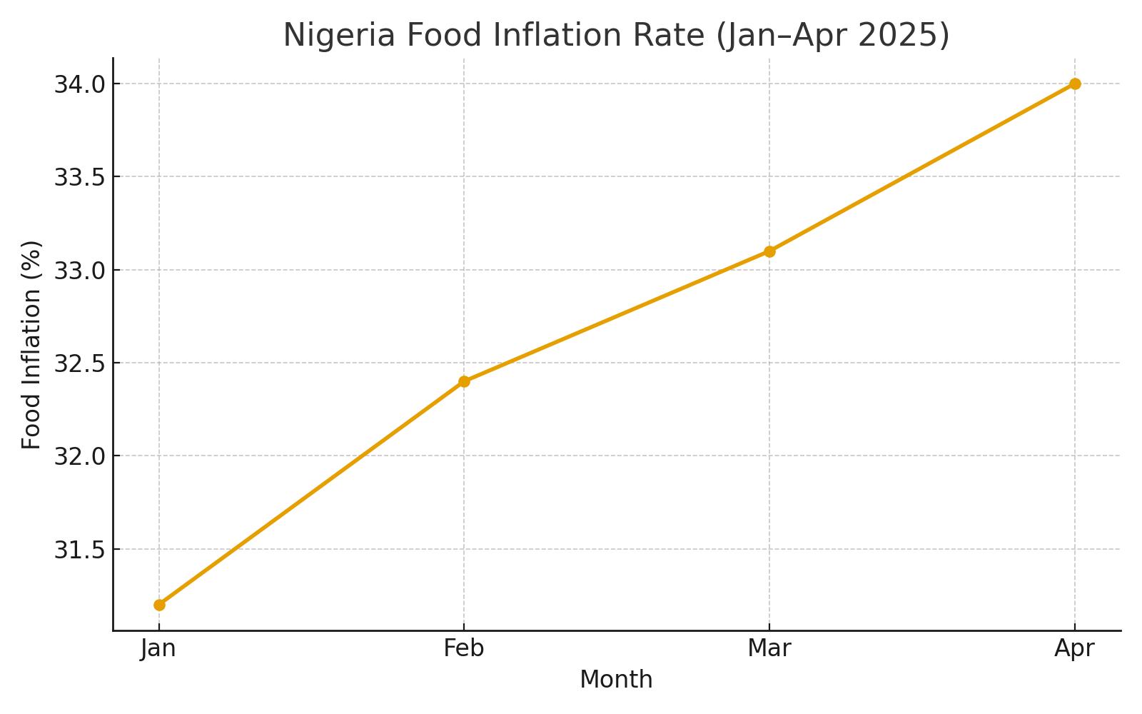 Food inflation in Nigeria has shown no sign of cooling. By April 2025, NBS reported a year-on-year increase of roughly 34 per cent, fuelled by the naira’s depreciation, high transport costs, and insecurity in key farming zones.